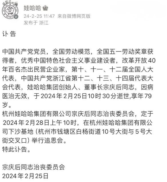 2月25日,娃哈哈官方微博发布讣告,娃哈哈集团创始人、董事长宗庆后,因病医治无效,于2024年2月25日10时30分逝世,享年79岁。