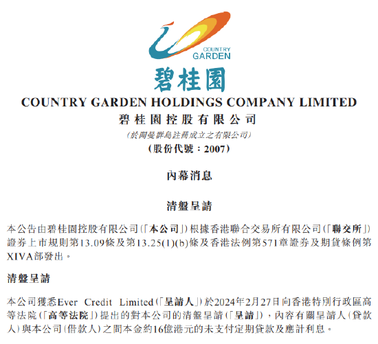 正文 碧桂园:Ever Credit向香港高等法院提出对公司的清盘呈请,公司将极力反对 admin V管理员 /2024-02-28 /32 阅读 0228 此篇文章发布距今已超过359天,您需要注意文章的内容或图片是否可用! 2月28日,碧桂园在港交所公告,公司获悉Ever Credit Limited(呈请人)于2024年2月27日向香港特别行政区高等法院提出的对公司的清盘呈请,内容有关呈请人(贷款人)与本公司(借款人)之间本金约16亿港元的未支付定期贷款及应计利息。公司将极力反对呈请。