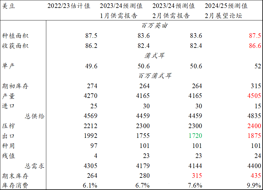 2月USDA报告下调2023/24年度美豆出口预估至17.2亿蒲(前值17.55亿蒲),保持23亿蒲压榨预估不变,使得期末库存上升至3.15亿蒲(前值2.8亿蒲),继续朝着宽松格局演变。最新的预判已经朝向24/25年度的平衡表,在展望论坛中,USDA预测新季美豆种植面积或来到8750万英亩,即便压榨&出口等需求分项有机会进一步提高,但累库的压力和方向没有变化,新季库存或增加到4.35亿蒲。