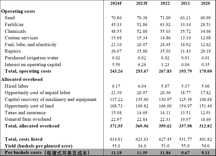 过去的经典经验是,通常每一次美豆期末库存从2亿蒲逐步走高到5亿蒲的过程中,都伴生出现美豆价格跌向成本的过程。2024年年初至今无疑再对这一逻辑进行提前的定价或抢跑。