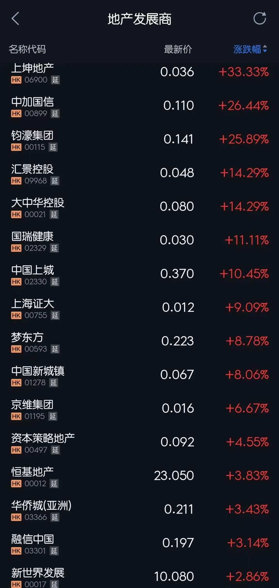 受该政策影响,一批内房股午后走高,截至收盘,上坤地产股价上涨33.33%,汇景控股涨超14%,恒基地产、融信中国、新世界发展、路劲等均出现不同程度上涨。