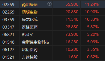 医药外包概念股集体大涨,药明康德涨超11%。消息面上,东北证券指出,当前阶段,海外CXO业绩表现分化明显,临床CRO、CDMO公司业绩表现较好,而临床前CRO相对压力较大,该类资产受到投融资不利影响更大。该行认为,随着美联储进入降息周期,前期受到该因素负面影响的公司将会迎来业务修复阶段。