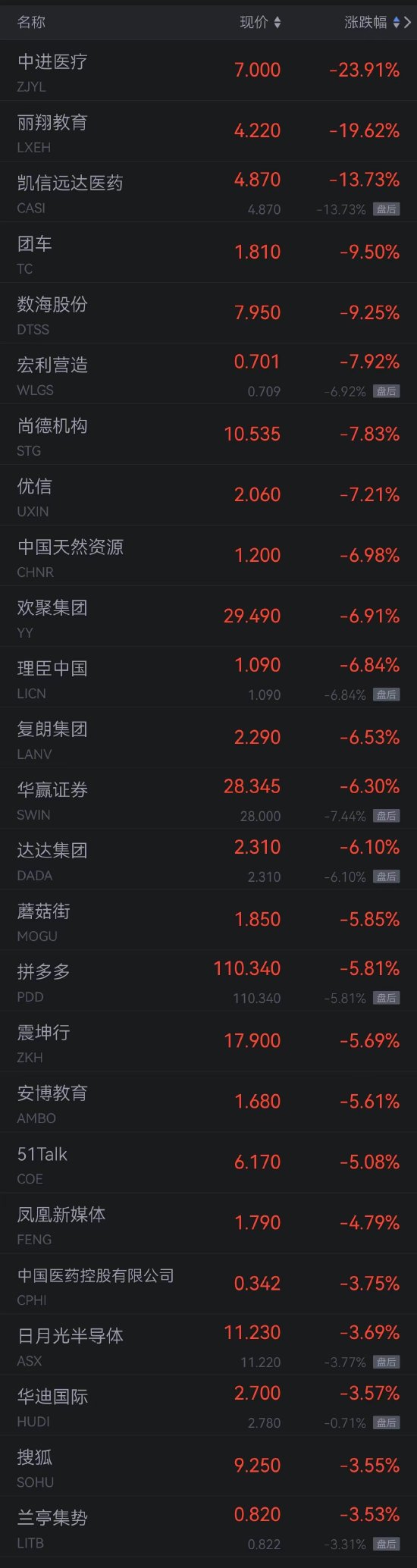 中进医疗跌超23%,丽翔教育跌超19%,凯信远达医药跌超13%,团车、数海股份跌超9%,宏利营造、尚德机构泛、优信跌超7%,中国天然资源、欢聚集团、理臣中国、复郎集团、华盈证券、达达集团跌超6%,蘑菇街、拼多多跌超5%。