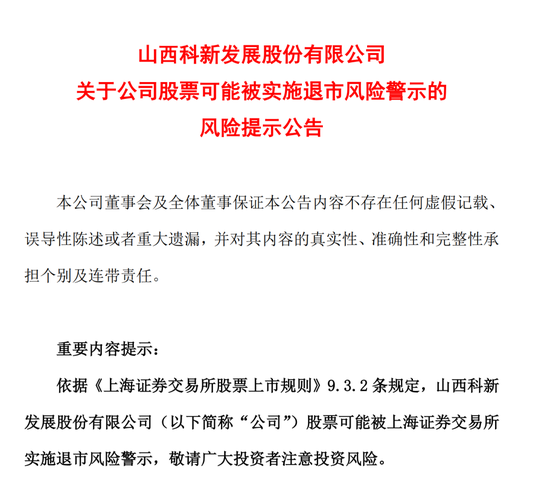 值得一提的是,业绩预告更正后,意味着科新发展或将触及《上海证券交易所股票上市规则》规定的对公司股票实施退市风险警示的情形。公司股票在2023年年报披露后将可能被实施退市风险警示(即股票简称前冠以“*ST”)。