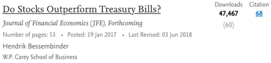 贝森宾德最早被投资圈关注是在2018年,他发表了一篇名为《股票表现优于国库券吗?》(Do Stocks Outperform Treasury Bills)的论文。据不完全统计,该论文被下载了近5万次,被68篇论文引用,对于学术界来说,相当于一部高票房大片。
