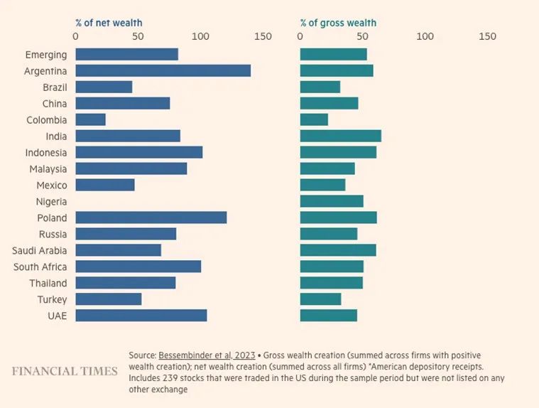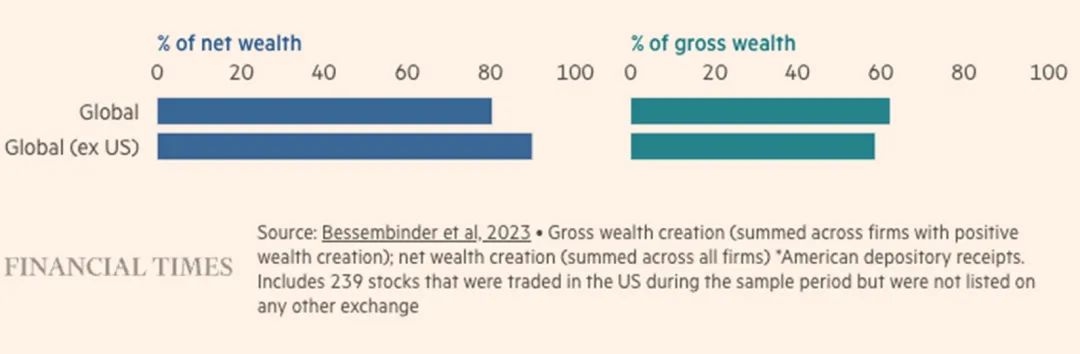 贝森宾德对美国以外的近47000只股票进行了类似的分析,包括26个发达经济体和16个发展中经济体。如下图所示,在1990年到2020年,在美国,排名前1%的公司贡献了美股约80%的净价值和62%的总价值;而类似的,在美股以外的国家,排名1%的贡献了约90%的净价值和59%的总价值。