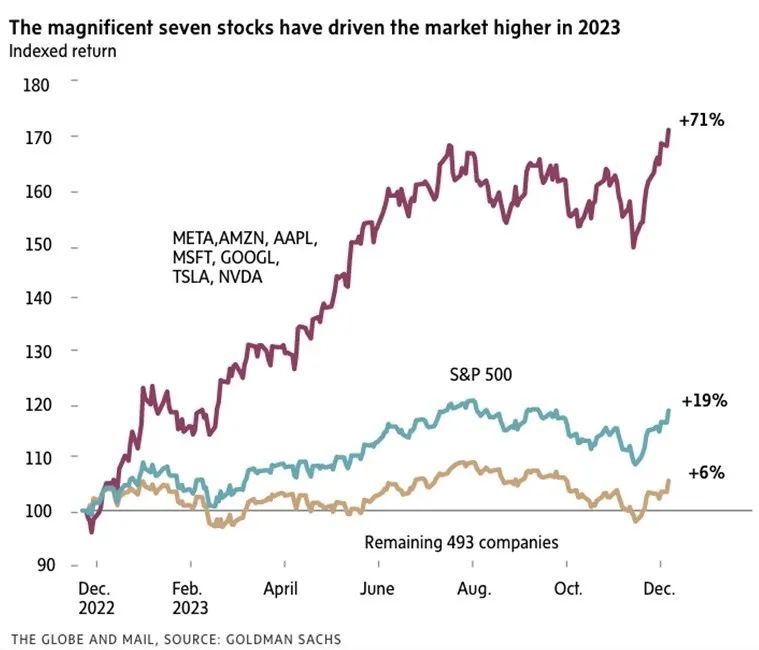 此刻美股市场暗流涌动的交易情绪,被称为FOMO(错过恐惧症),YOLO(孤注一掷)以及MOMO(追逐动量)此消彼长且彼此交错的混合态。起因则源于对科技股支撑下的美股“越涨越窄”的担忧:美股“七蛟龙”(Magnificent Seven)市值现已占到标普500指数总市值的29%;在2023年这 7 只股票贡献了标普500几乎三分之二的涨幅,而标普中有一半的个股在过去一年中是下跌的。投资人们调侃说,两年前好莱坞的B级烂片Magnificent Seven(《豪勇七蛟龙》),在华尔街可以改头换面、粉墨登场再演一遍。