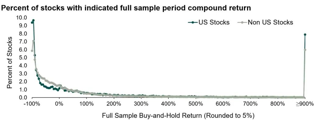 但如果拉长持有周期,假设一直持有股票,并且把收益进行复利累积,则会得到一个完全不同的分布图。可以看到,对美国国内及国外的股票来说,最常见的结果是左侧的-100%,也就完全的损失,同时在右侧,有一个非常长的长尾,右侧尾部最突出的数据,就代表了那些增长超过9倍的超级明星股。