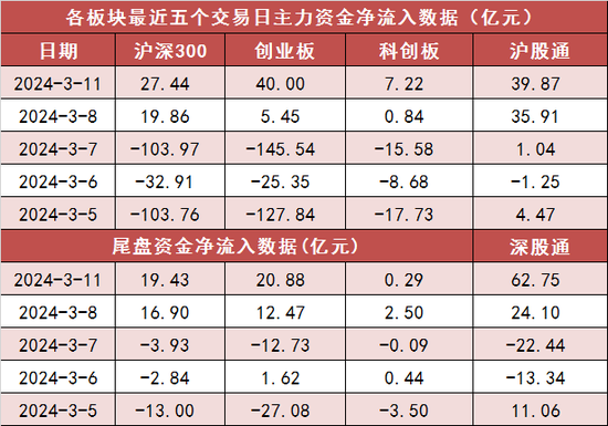 沪深300今日主力资金净流入27.44亿元,创业板净流入40.00亿元。沪股通净流入39.87亿元,深股通净流入62.75亿元。