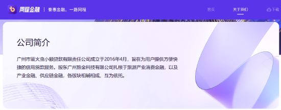 而据同程金融官网,其在公司介绍中表示,广州市萤火虫小额贷款有限责任公司成立于2016年4月,旨在为用户提供方便快捷的信用货款服务。股东广州旅金科技有限公司扎根于旅游产业消费金融,以及产业金融、供应链金融。