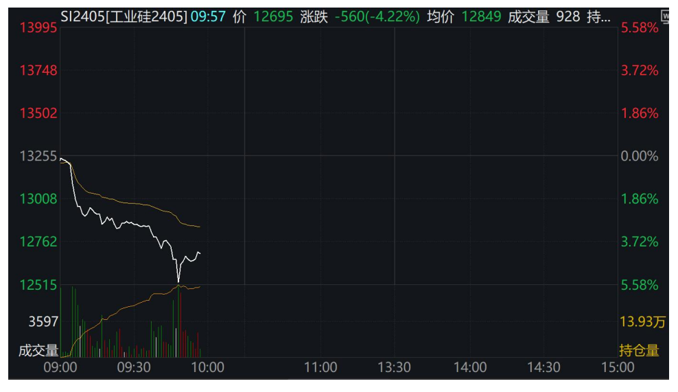 2024年3月15日,工业硅期货价格快速走跌,主力合约SI2405价格跌破13000元/吨的支撑,最低跌至12515元/吨,跌幅约5%。市场认为在高仓单库存背景下,西北及西南产能释放后,工业硅产业需要产能出清,因此价格将跌至成本线下方,直到部分企业关停。随着主力合约逐步转向丰水期合约,成本端仍有下跌预期,价格下跌提前反映市场预期。
