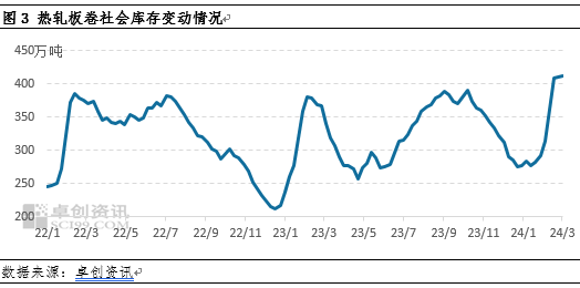 2024年春节后第一周,热轧板卷社会库存攀升至407.8万吨,较节前增幅30.33%,随后社会库存继续累积,最新数据显示,热轧板卷社会库存达到411.7万吨水平,较去年同期同比增加20.8%。库存的累积一定程度反应出市场需求的不畅,而在商家库存压力较高的背景下,逐渐出现低价销售回款的情况。