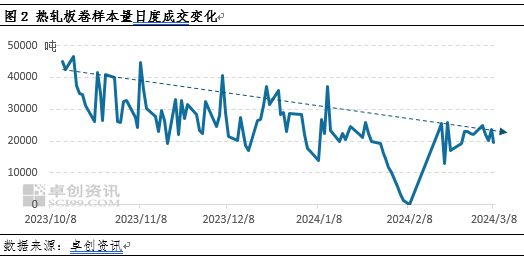 2024年春节后开市,市场需求迟迟未见起色,且在多个省市基建项目延迟开工的情况下,市场需求预期更加低迷,就卓创资讯监测的热轧板卷日度成交数据来看。春节后开市,市场日均样本成交量在2.13万吨,较节前正常水平2.84万吨(为节前日均成交量),环比下降25%。市场成交表现不畅,一定程度打击市场信心,对价格形成拖累。