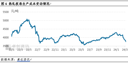就热轧板卷成本端变化来看,春节后原材料价格基本保持震荡下跌趋势,带动热轧板卷成本线逐步下移,最新数据来看,截至3月11日,热轧板卷成本在3756.41元/吨,较春节后首日成本跌398.17元/吨,跌幅9.58%,成本线的下移难以支撑现货价格,反而对现货价格形成下行牵引,带动市价下跌。