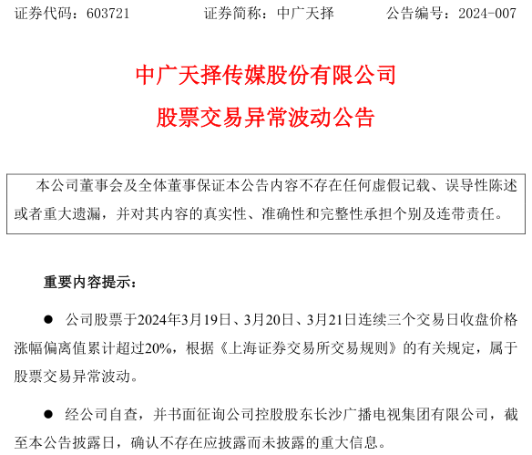 同时,中广天择提示,经自查,并书面征询公司控股股东长沙广播电视集团有限公司,截至公告披露日,公司、控股股东确认不存在涉及上市公司的重大资产重组、股份发行、重大交易类事项、业务重组、股份回购、股权激励、破产重整、重大业务合作、引进战略投资者等重大事项。