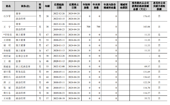 再到2023年的197.61万元、158.01万元 、179.27 万元、170.84万元 、194.30万元 ,其中王宁在2022年12月增加了董事职位;公司财务总监谢小强的税前报酬也由2021年的56.88万元涨至2022年的131.69万元,再涨至2023年的206.25万元。