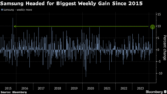 这就是为什么当有报道称黄仁勋计划购买三星内存时,市场感到意外。他的讲话推动这家韩国市值最高公司的股价有望实现10%的周涨幅,创2015年以来最大。