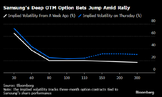 期权交易员则更为矛盾。本周,三星电子在两个方向上的押注头寸都激增,其中包括押注该股未来三个月下跌70%的看跌期权,以及未来三个月若该股飙升300%就会套现的看涨期权。