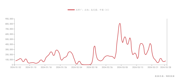 3月需求稍有好转,全国油厂成交量及提货量逐步抬升。据Mysteel农产品数据监测统计,三月全国油厂已经累计成交逾600万吨,日均成交约30万吨,较一二月成交大幅提升。月初是受到豆粕价格的提振以及对油厂停机的担忧,豆粕成交提货大幅增加,但3月整体仍处季节性淡季,需求提升力度有限,加之后期豆粕供应紧张缓解、养殖利润不高,豆粕需求回落。