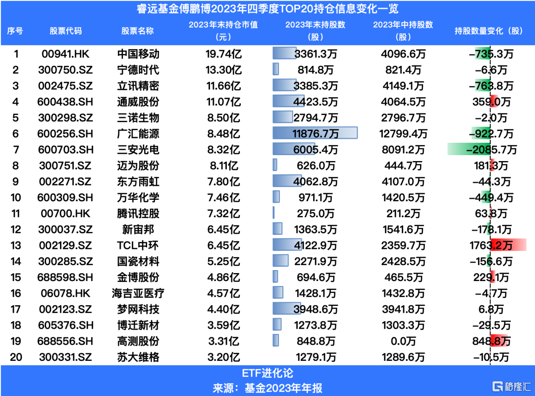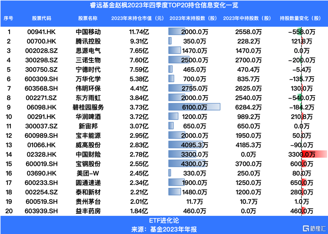 赵枫2023年年末的前二十大重仓股名单变化也不大,最大的动作是新进中国财险、益丰药房,下半年合计买入3300万股和460万股。