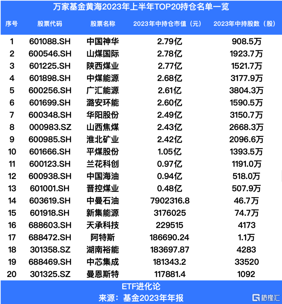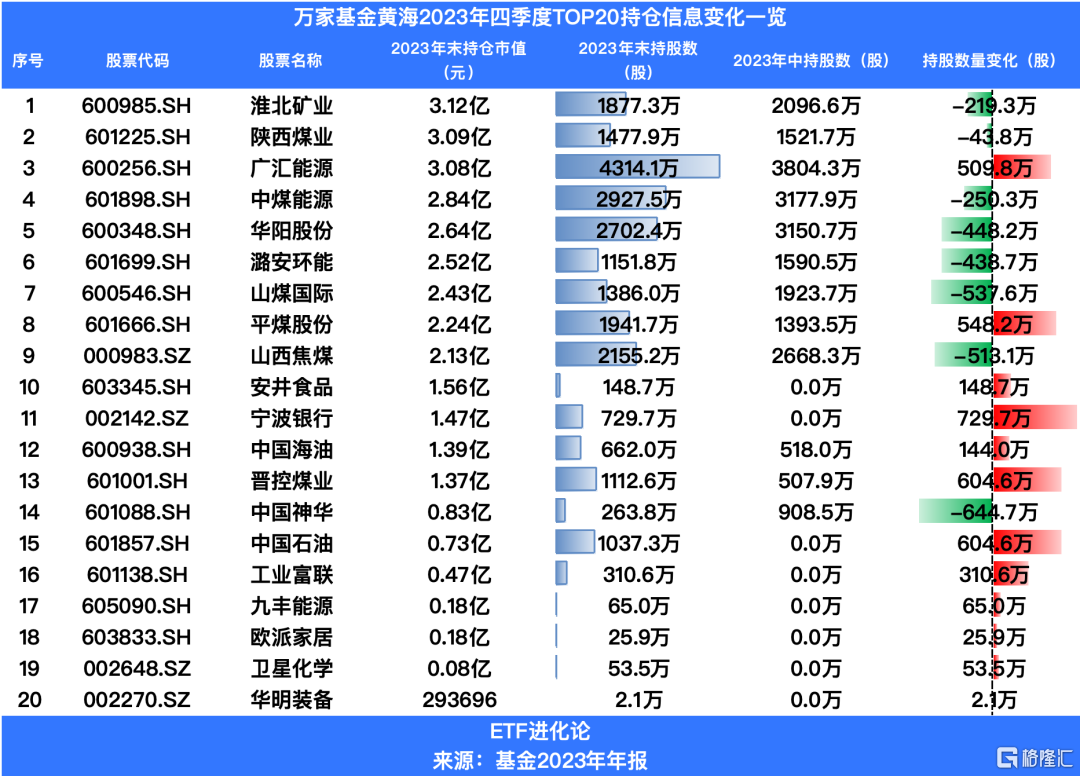 从2023年前二十大重仓股来看,黄海对前期获利较大的以能源类个股为代表的高股息题材整体是减仓,在2023年下半年合计分别减持淮北矿业、中煤能源、华阳股份、潞安环能、山煤国际、山西焦煤和陕西煤业219.3万股、250.3万股、448.2万股、438.7万股、537.6万股、513.1万股和-43.8万,还减持中国神华644.7万股。