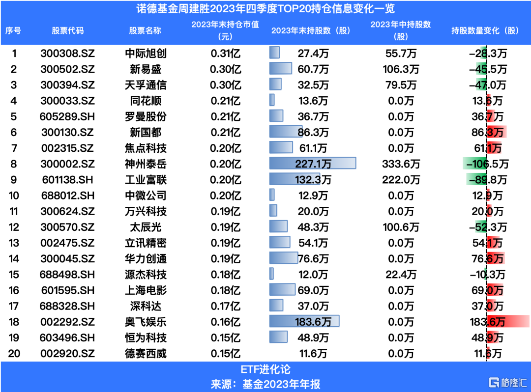从前二十大重仓股的名单来看,可谓是大换血。相比2023年上半年,前二十大名单里有13只个股是新晋的,分别是同花顺、罗曼股份、新国都、焦点科技、中微公司、万兴科技立讯精密、华力创通、上海电影、深科达、奥飞娱乐、恒为科技和德赛西威。