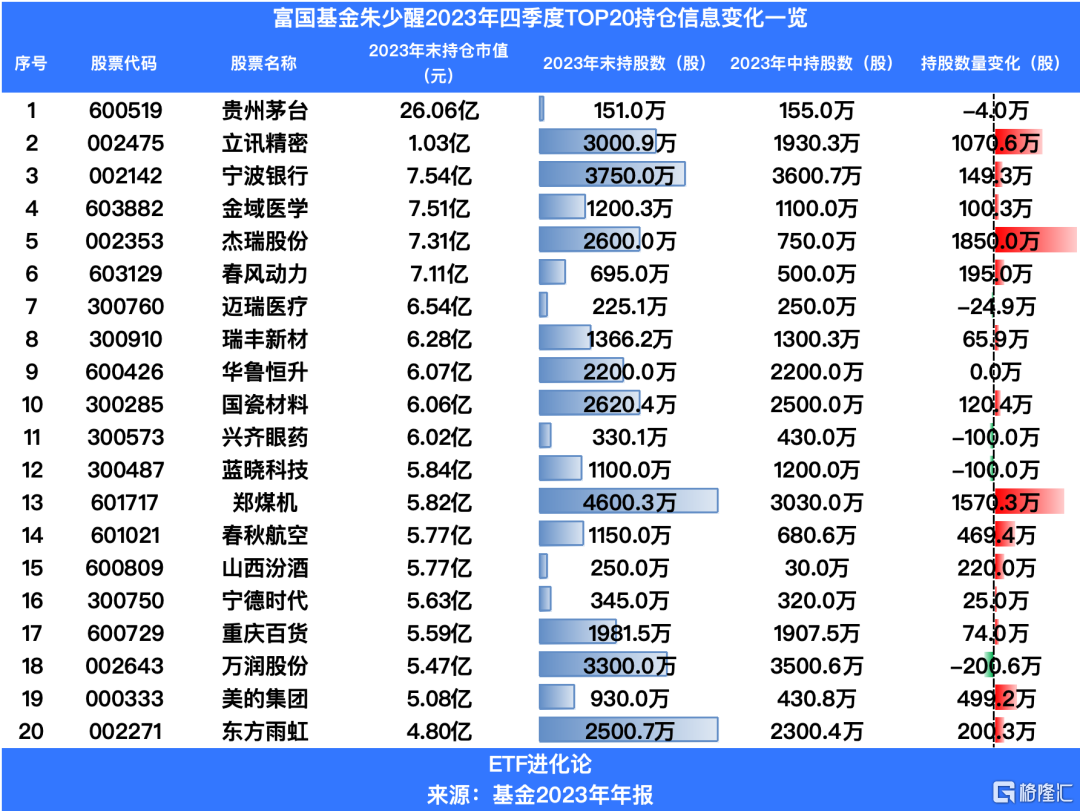 对比2023年年末和2023年上半年的前二十大权重股,朱少醒一如既往喜欢“翻石头”,动作最明显的就是加仓立讯精密、杰瑞股份、郑煤机,加仓数量分别高达1070.6万股、1850万股和1570万股,直接把后两者抬进前二十大榜单中。