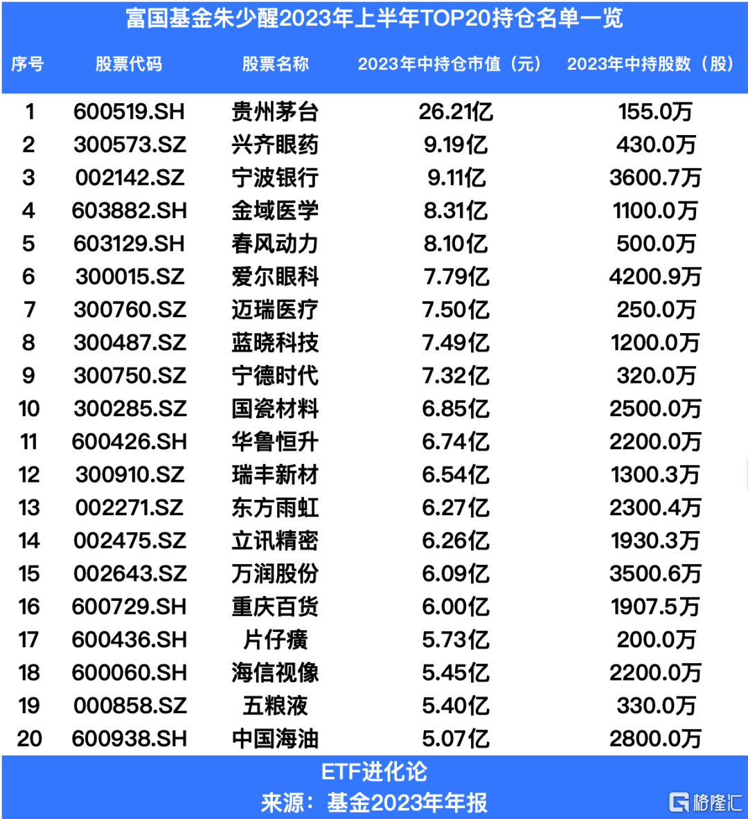 朱少醒在去年下半年合计分别加仓春秋航空、山西汾酒和美的集团469.4万股、220万股和499.2万股,爱尔眼科、片仔癀、海信视像、五粮液、中国海油同期遭减持1200.9万股、20万股、300万股、320万和2500万股,五粮液有点清仓式减持的意味,截至2023年年末,只剩10万股的仓位了。