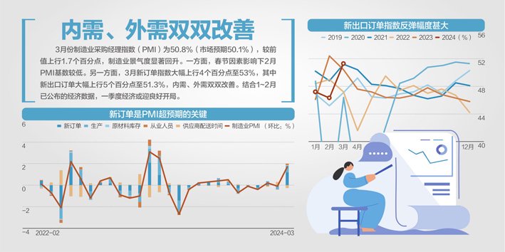 王青认为,展望未来,4月PMI指数有望继续运行在荣枯平衡线上方,除了外需回暖、国内大规模设备更新及耐用消费品以旧换新等稳增长政策效果继续显现外,3月22日国务院常务会议要求进一步优化房地产政策,释放了稳楼市的重要信号,年初以来楼市偏冷势头有望缓解。与此同时,“三大工程”将进入全面推进阶段。这些都将缓解房地产投资下行压力,提振宏观经济增长动能。