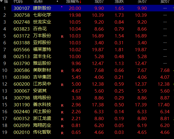 板块内所有个股飘红,更是罕见地出现半数以上个股涨停的现象,其中七彩化学(维权)仅约5分钟就垂直20%涨停,万丰股份、亚邦股份、雅运股份等多股开盘一字涨停。