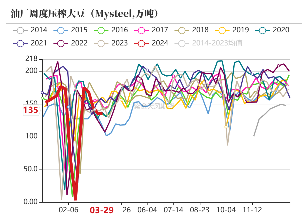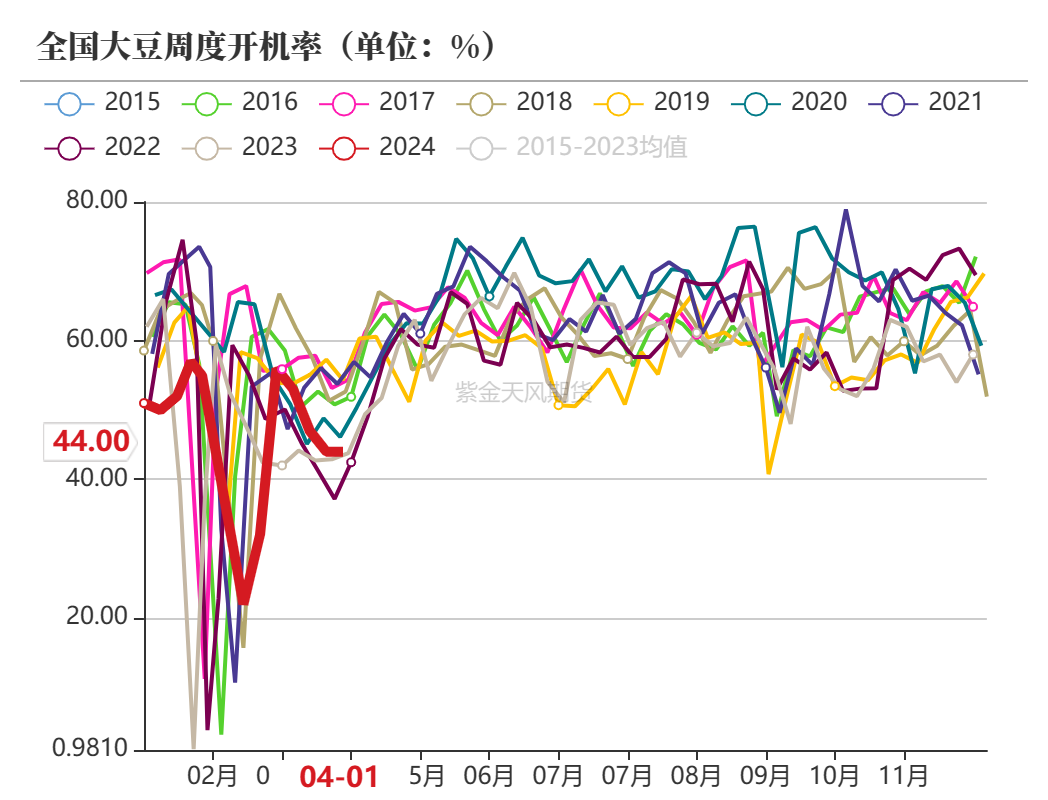 截至3月29日当周,125家油厂大豆实际压榨量为152.24万吨,开机率44%(前周压榨量153.52万吨,开机率为44%)。