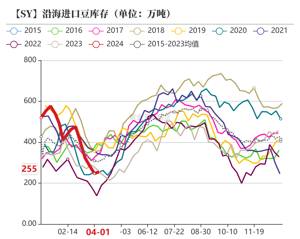 到港库存:中性 本周到港大豆数量环比增多,港口大豆再度累库。4月大豆到港数据下调,供应压力或后置到5月。
