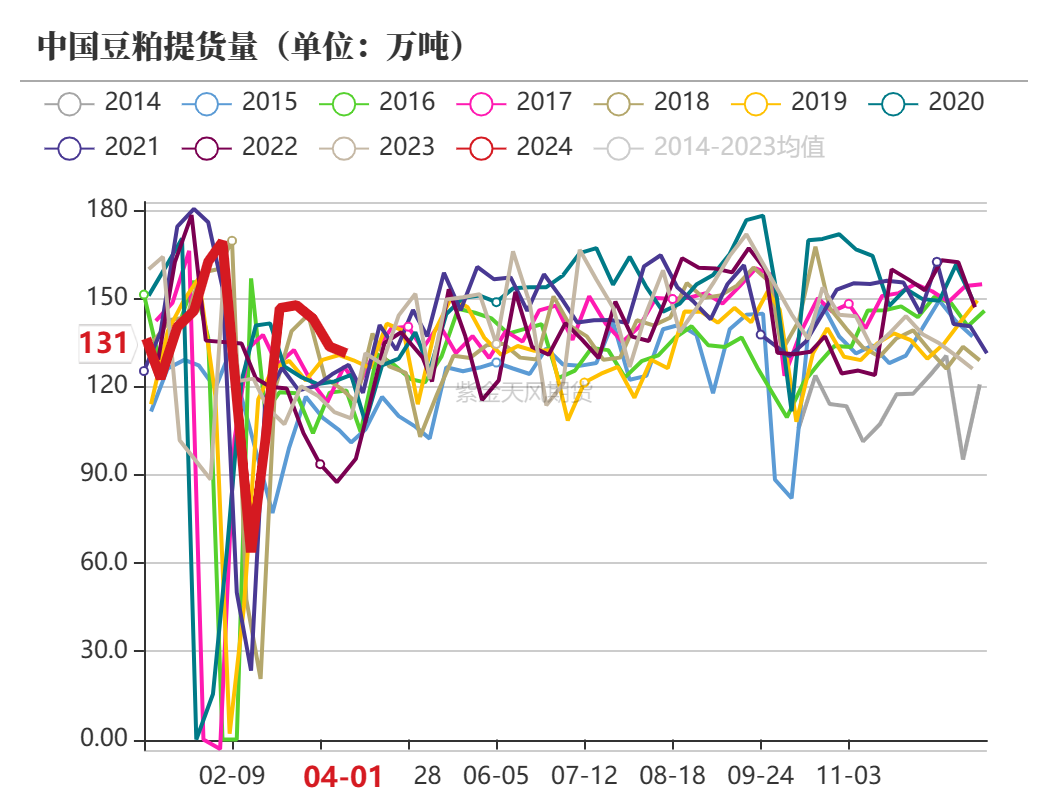 提货:截至4月1日当周,豆粕提货量为131万吨,前周134万吨,提货环比减少3万吨。