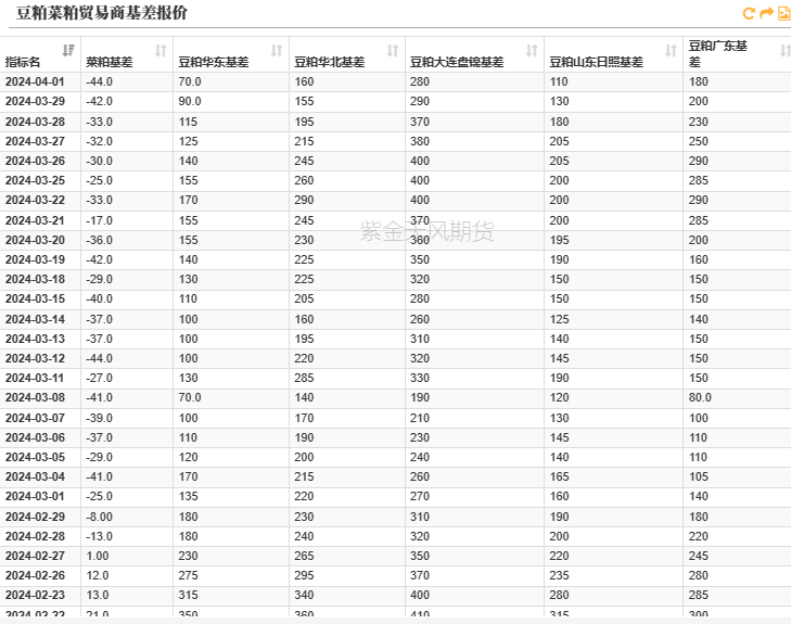 豆粕:4月1日,豆粕现价为2405+70元/吨(华东),此前3月25日为2405+155元/吨。