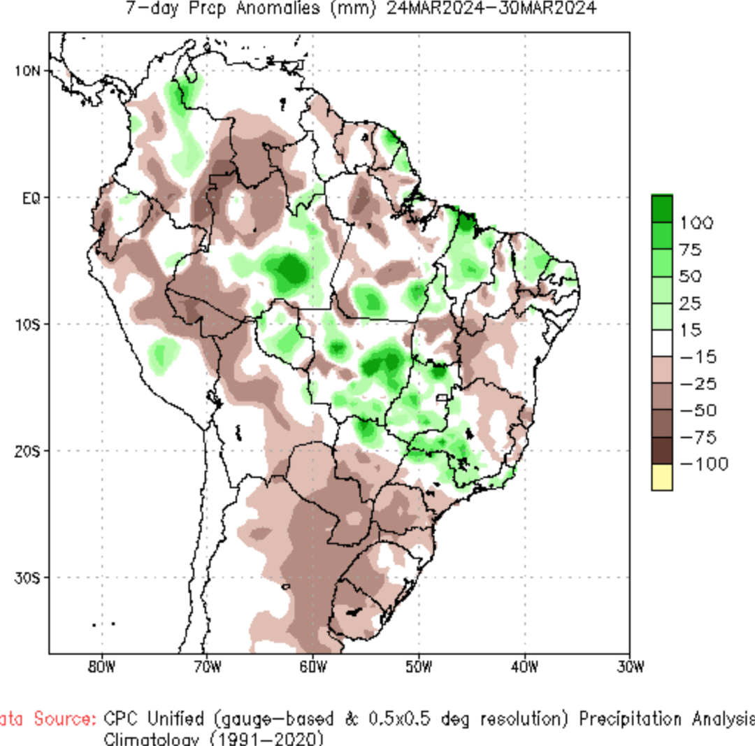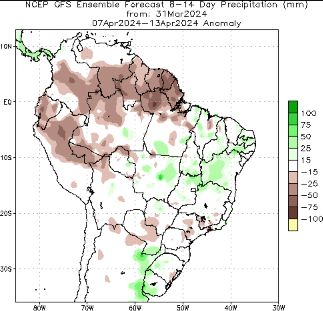 3.24-3.30,RS降雨量较较均值水平少15-25mm。未来一周降雨预报中(3.31-4.6),RS东部区域降水仍较均值水平少15-25mm。未来两周(4.7-4.13)比均值水平高15-25mm的降雨。