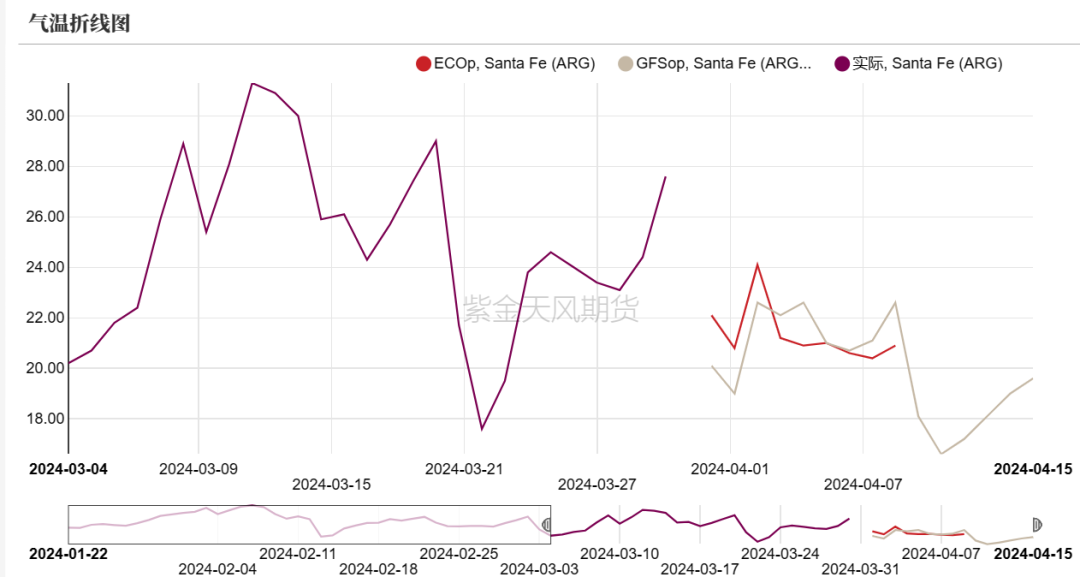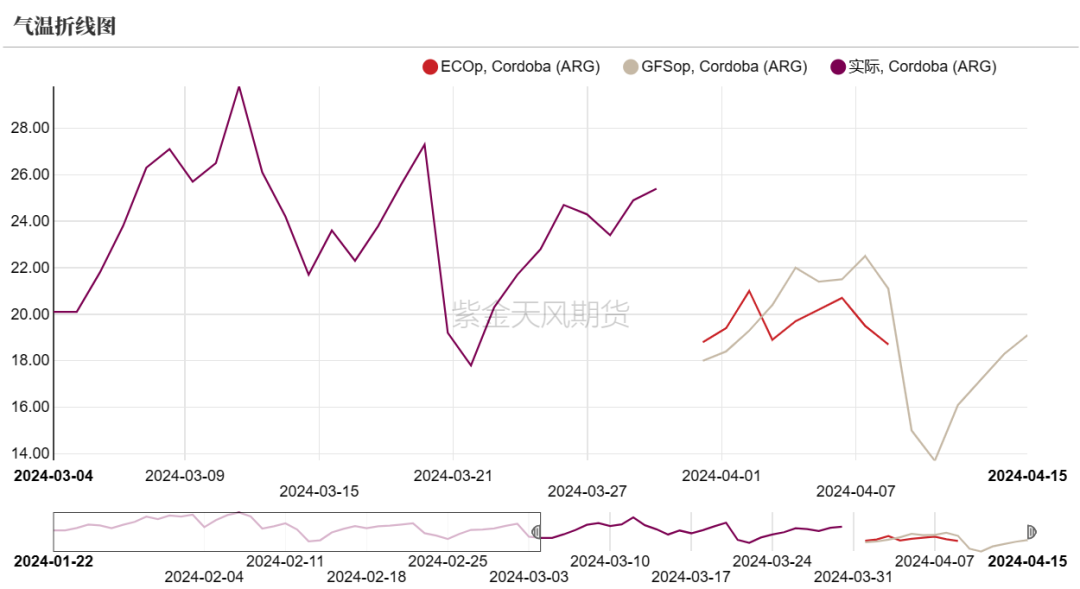 GFS及EC模型显示,未来一周(4.2-4.9)阿根廷大豆主产省的降温趋势较为明显。布宜诺斯艾利斯气温于16-20℃区间,圣菲于20-24℃区间,科尔多瓦省于18-22℃区间。