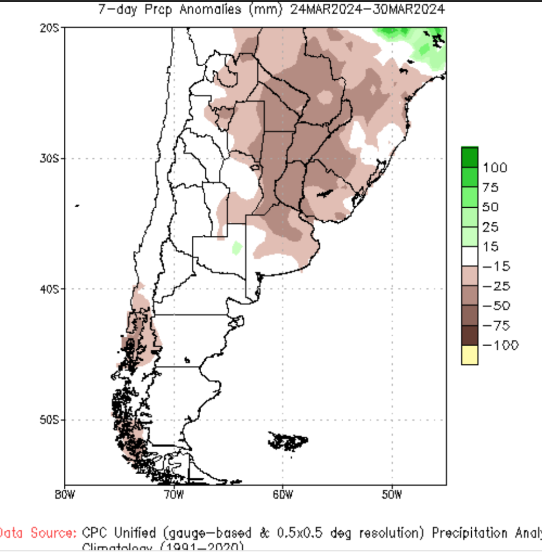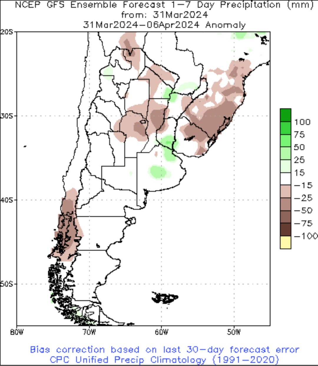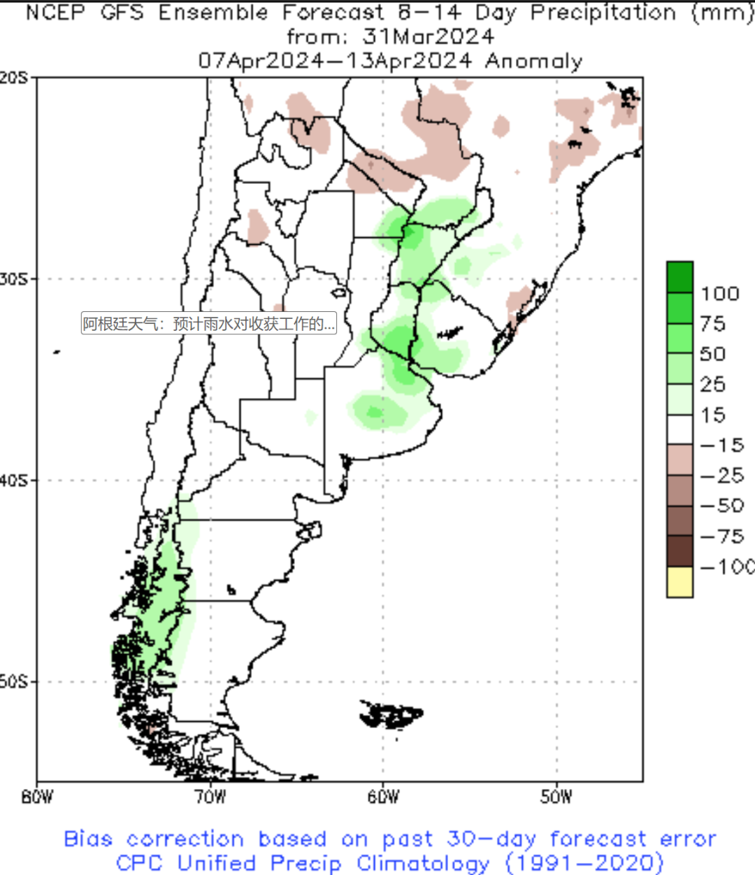 3.24-3.30,圣菲省和布宜诺斯艾利斯省、科尔多瓦省降水量较历史均值水平少15-50mm。4月中上旬,阿根廷大豆开始收获,未来一周(3.31-4.6)圣菲和科尔多瓦降雨依旧较历史均值少15-50mm,不过布宜诺斯艾利斯有一些降雨的增量,约15-25mm,未来两周(4.7-4.13)这种趋势更加明显。