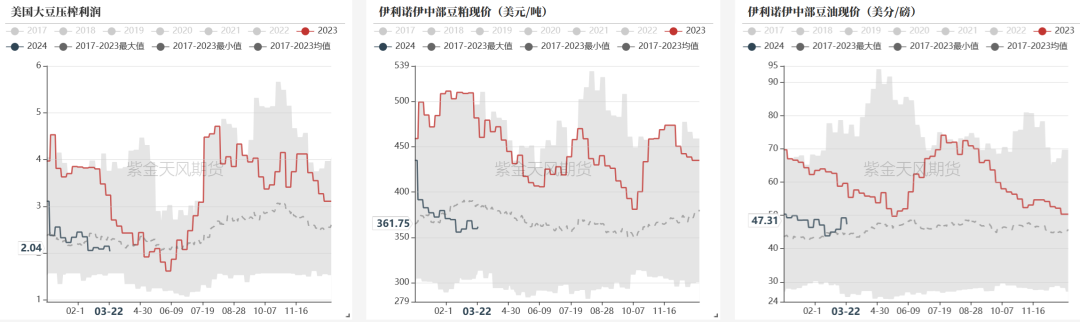 截至2024年3月22日,美国大豆压榨利润为2.04美元/蒲(前周2.15美元/蒲,周度恶化0.11美元/蒲);豆油价格下跌,伊利诺伊州的毛豆油卡车报价为47.31美分/磅(前周49.25美分/磅,周度下跌1.94美分/磅);伊利诺伊州大豆加工厂的48%蛋白豆粕现货价格为361.75美元/吨(前周359.6美元/吨,周度上涨2.15美元/吨)。