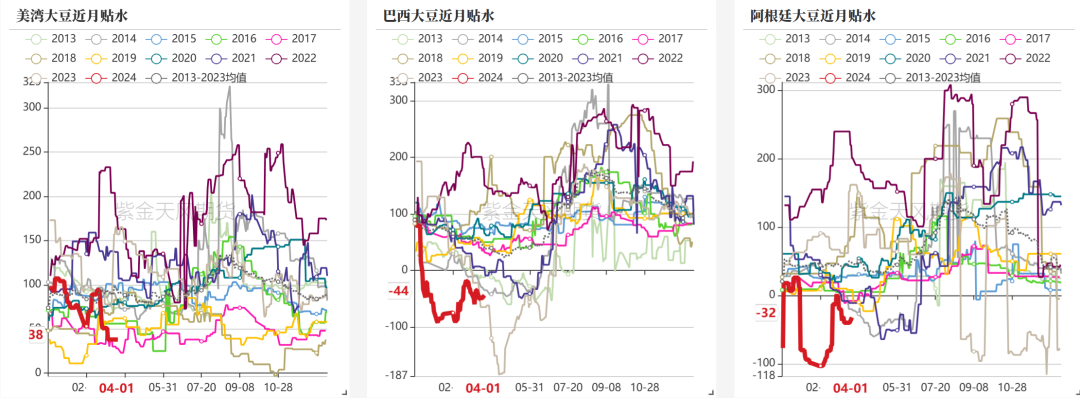 截至4月1日,美湾、巴西、阿根廷大豆近月贴水分别为38美分/蒲(前周为38美分/蒲,周度持平)、-44美分/蒲(前周为-50美分/蒲,周度上涨6美分/蒲)、-32美分/蒲(前周为-40美分/蒲,周度上涨8美分/蒲)。
