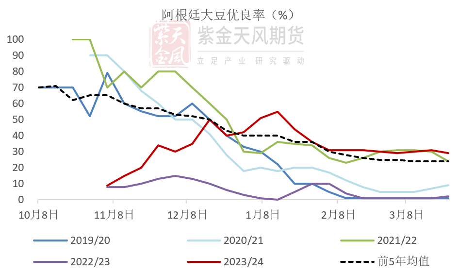 截至3.26,阿根廷大豆优良率29%,去年同期仅2%,历史五年同期均值24%。土壤含水率74%,前周78%,去年同期仅48%。