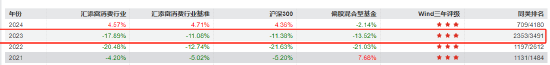 胡昕炜管理的汇添富消费行业混合2023年亏30.94亿元,较2022年同期亏损(44.95)幅度收窄。除去客户维护费,收取了1.39亿管理费。