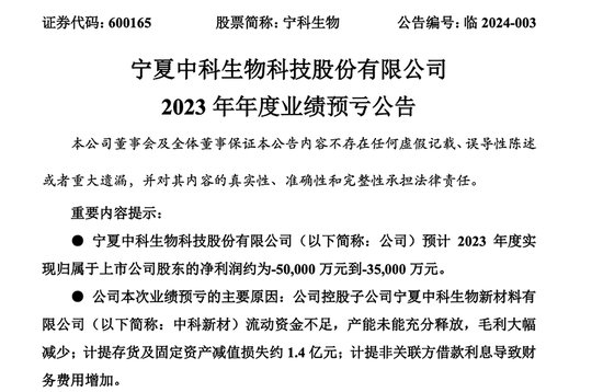 根据1月30日宁科生物发布的业绩预亏公告,公司2023年度预计亏损3.5亿元至5亿元,连续三年大幅亏损。同时,公司在2023年三季度末的流动负债规模达17.14亿元。
