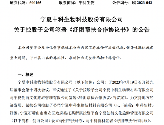 2023年7月19日,宁科生物披露,为支持地方经济发展、帮扶中科新材纾困,宁夏石嘴山市惠农区政府委托其所属投资平台宁夏创衍文化旅游管理有限公司设立纾困帮扶计划,与中科新材签署《纾困帮扶合作协议》。