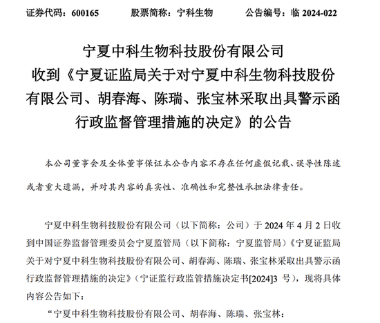 4月2日,宁夏证监局对宁科生物及董事长胡春海、总经理陈瑞、董秘张宝林等采取出具警示函的行政监督管理措施。