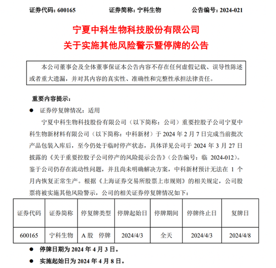 宁科生物表示,鉴于公司仍存在流动性问题,并且尚未明确解决方案,中科新材预计无法在1个月内恢复正常生产。根据《上海证券交易所股票上市规则》,“公司生产经营活动受到严重影响且预计在3个月内不能恢复正常”,公司股票将被实施其他风险警示(ST)。因此,宁科生物4月8日起复牌将实施其他风险警示,变身“ST宁科”。