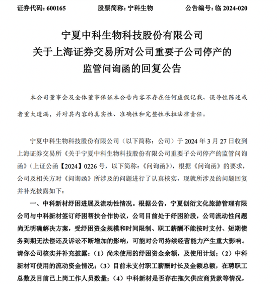 3月26日晚间,宁科生物公告称,公司子公司中科新材自2月7日完成当前批次产品包装入库后,一直处于停产状态。3月27日,公司收到上交所下发《关于宁夏中科生物科技股份有限公司重要子公司停产的监管问询函》。