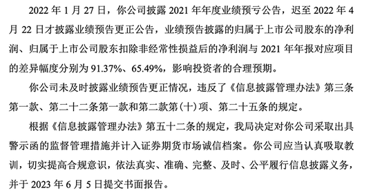 据公告,2022年1月27日,宁科生物披露2021年年度业绩预亏公告,迟至2022年4月22日才披露业绩预告更正公告,业绩预告披露的归母净利润、归母扣非净利润与2021年年报对应项目的差异幅度分别为91.37%、65.49%,影响投资者的合理预期。公司由此违反《信息披露管理办法》相关规定。