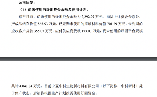宁科生物称,截至目前,尚未使用的纾困资金余额为2292.97万元。扣除上述资金余额外,算上产成品结存、已采购未使用的原辅材料、未到期的应收客户货款等,尚未使用的纾困平台规模共计4041.84万元,中科新材后续将根据生产计划按需使用纾困资金。