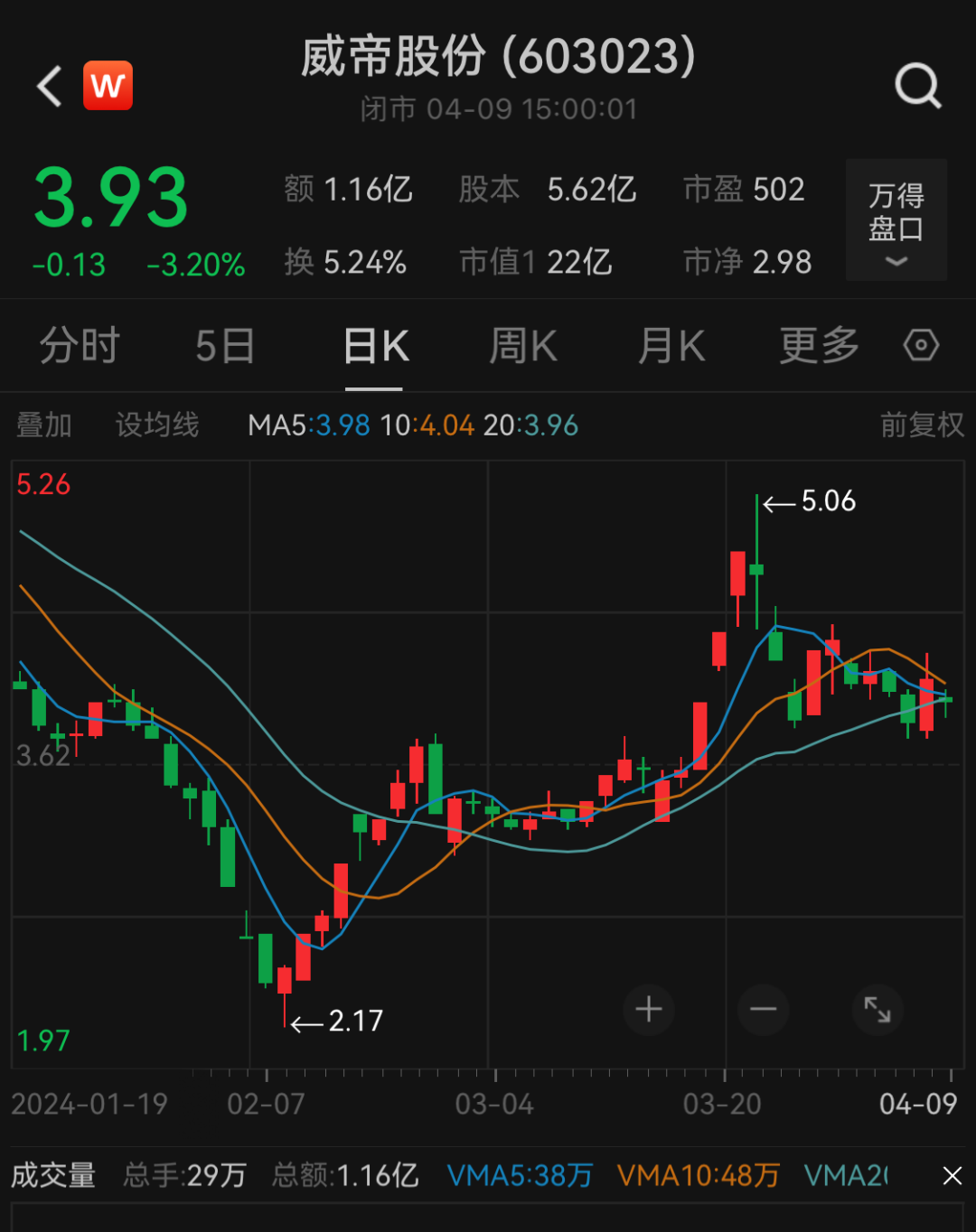 截至4月9日收盘,威帝股份每股报3.93元,下跌3.2%,公司最新市值为22亿元。