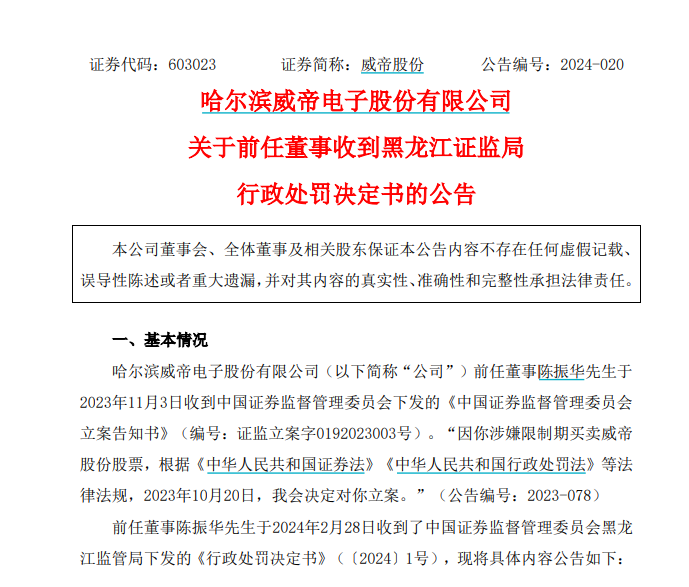 去年11月,因涉嫌在限制期买卖威帝股份股票,威帝股份前任董事陈振华被证监会立案,今年2月28日,陈振华收到黑龙江证监局下发的《行政处罚决定书》。